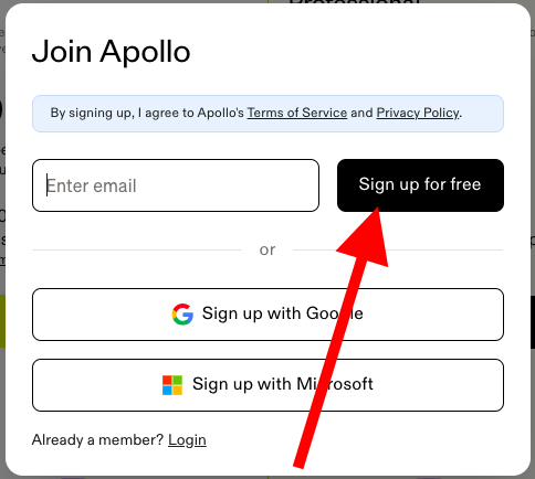 Go to the official Apollo.io website by clicking the “SHOW COUPON” button above or directly navigating to Apollo.io.