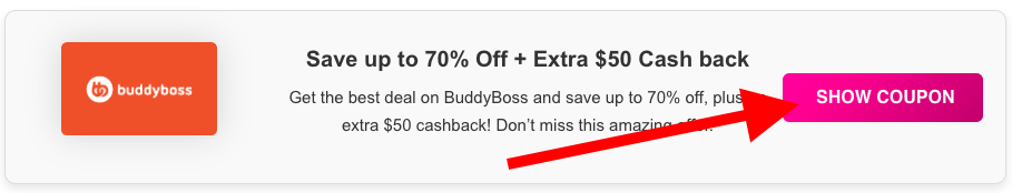 - First, click the “SHOW COUPON” button next to your selected BuddyBoss offer. This will reveal your unique coupon code.