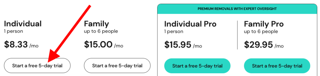 | Individual | Personal data removal | 1 Person | $8.33 / month |