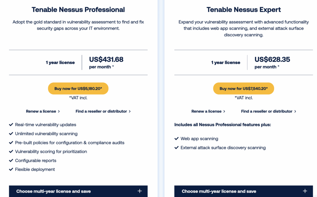 Browse Tenable’s offerings such as Nessus Pro, Tenable.io, or SecurityCenter, and choose the one that fits your cybersecurity needs. - Proceed to Checkout